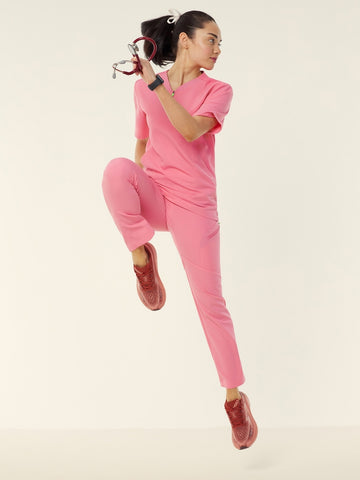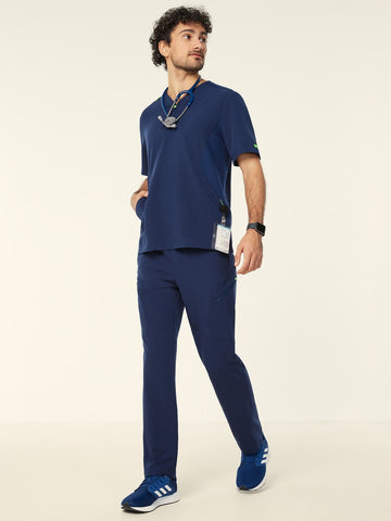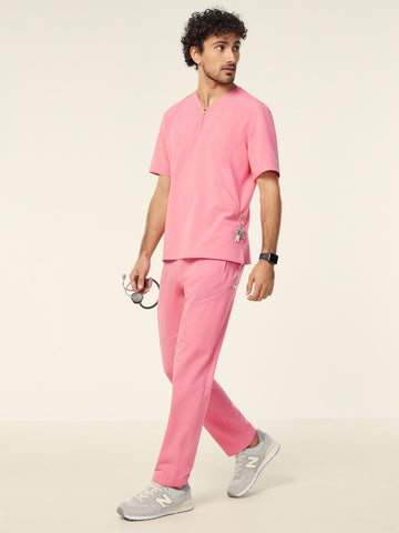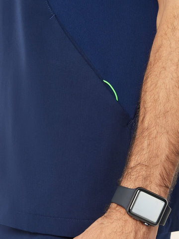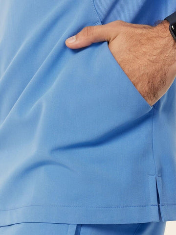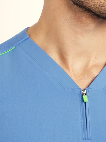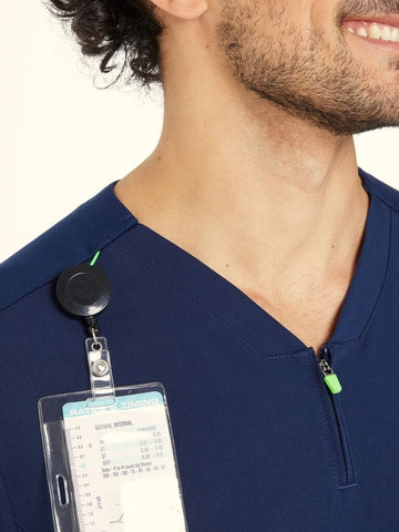 The Charles Scrub Top combines a slim fit with sleek, functional design. Featuring a V-neck opening and a center front zip, it offers ease of wear and a customizable fit. With short sleeves and a mid-length cut, this top provides both comfort and style. Two hip pockets offer practical storage, while contrast key loops at the shoulder and one pocket add a stylish touch. Side splits enhance movement, and the high-stretch rib fabric side panels ensure extra stretch and comfort for all-day wear.